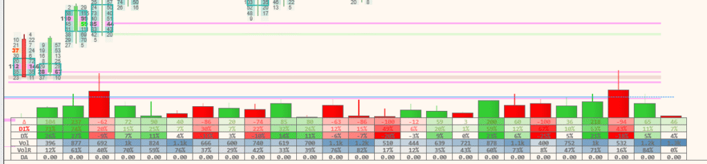 The data grid enables you to show a variety of metrics along the bottom of the chart, allowing you to easily compare data between bars. For some options, the background colours can vary in strength to reflect the bar’s size/values relative to other values currently displayed. This allows you to immediately zoom in on the most important bars on the chart, as in the example below. This is a fundamental concept in pjsProfileBars.