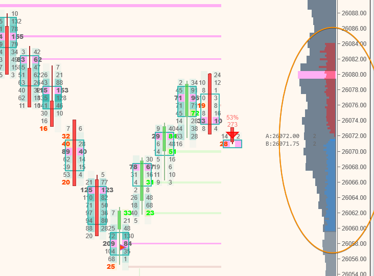 Shows a histogram representing the current market depth draw at the current price, per the example below