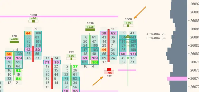 The data block shows a block above or below the bar, containing per-bar information, such as delta, per the example below. This can be a better way to display important information near your bar, rather than down in the data grid, depending on your preferences.