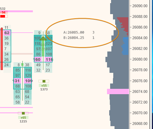 The numbers to the right of the last traded bid and ask prices are the number of contracts traded at those prices, before the price traded through them. The number represents the number of contracts being ‘absorbed’ on each side. The count for each side is monitored separately, and each count will reset when the price trades through the level. High numbers will be evident at times of absorption.