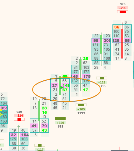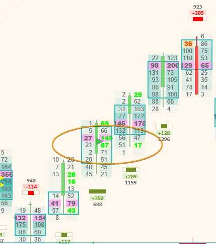 pjsprofileBars performs statistical analysis on all deltas per price level in each bar, and determines when anomalies occur. These anomalies can be marked on the chart with a right-angled triangle, coloured based on the delta, such as in this example, where significant aggressive buying was detected.